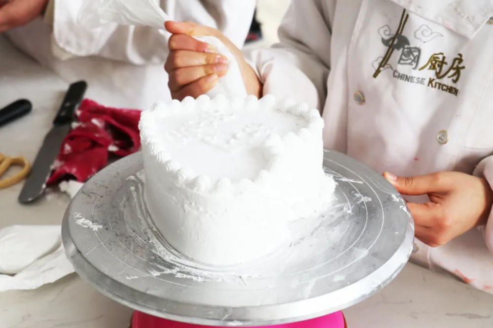 烘焙专业学生实训课堂在老师的精心指导下做出一盘盘精美的蛋糕